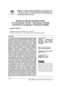 У статті проаналізовано вплив російської дезінформації на громадську думку США щодо підтримки України в умовах російсько-української війни. Розглянуто ключові аспекти, що визначають сприйняття американським суспільством необхідності військової та фінансової допомоги Україні. Особлива увага приділена еволюції суспільних настроїв у США, які зазнали значних змін під впливом дезінформаційних кампаній, спрямованих на послаблення довіри до офіційних повідомлень і міжнародних зобов’язань США. Результати соціологічних опитувань демонструють, що кількість американців, які вважають допомогу Україні надмірною, зростає. На основі аналізу даних Ґеллапа простежено, як російська дезінформація впливає на формування уявлень про війну, використовуючи наративи про економічно невигідну підтримку України для американських платників податків та нібито провокаційні дії США щодо Росії. Ці наративи посилюються у медіапросторі, особливо через соціальні мережі та альтернативні медіа, що створює сприятливе середовище для формування поляризованих поглядів. Також розглянуто ключові механізми поширення дезінформації, серед яких домінують маніпулятивні новини, фейкові звіти та спотворення реальних подій. Особливий акцент зроблено на стратегічному використанні емоційного впливу з метою створення негативних асоціацій щодо України. Зазначено, що російська дезінформація спрямована на підрив довіри до адміністрації США, її зовнішньої політики та міжнародних ініціатив у сфері безпеки. Розглянуто вплив громадських настроїв на політичні рішення США щодо України. Продемонстровано, як поширення скепсису серед американців щодо продовження фінансової підтримки Києва впливає на стратегічні підходи адміністрації Джозефа Байдена. Водночас робота підкреслює важливість протидії дезінформаційним кампаніям для забезпечення стійкої підтримки України з боку США. Результати цього дослідження надають інструменти для глибшого розуміння динаміки впливу дезінформації на громадську думку та прийняття рішень у США, а також висвітлюють виклики, які постають перед Україною в боротьбі за міжнародну підтримку.
