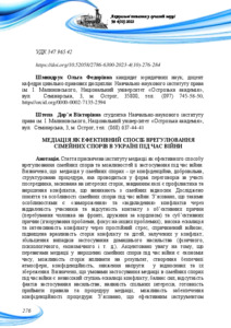 Шминдрук, О. Ф.(O. Shmyndruk) and Штепа, Д. В. (D. Shtepa) (2023) Медіація як ефективний спосіб врегулювання сімейних спорів в Україні під час війни (Mediation as an effective way of resolving family disputes in Ukraine during the war). Актуальні питання у сучасній науці. Серія «Право» (4(10)). pp. 276-285.