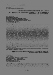 (The article is devoted to the analysis of stylistic, communicative-pragmatic and meta-linguistic features of the realization of multimodal allusion in the structure of the heading complexes of the texts of “The Economist” magazine. The growing interest in the study of the phenomenon of allusiveness is associated with the expansion of the boundaries of its analysis as a purely rhetorical means in the line of text linguistics to intertextual relations (intertextuality), the involvement and interaction of various sources of allusion (intermediality) and, finally, the inclusion of elements of various semiotic systems (multimodality) in the subject of the analysis. Such a comprehensive approach has made it possible not only to better understand the processes of formation, perception and decoding of complex multimodal allusive complexes, but also to identify a number of meta-language functions that it is able to realize from the point of view of social semiotics. When creating a headline complex, the author not only seeks to attract the reader's attention through an unusual combination of components or to make an aesthetic impression on him/her by imposing deep and hidden meanings on the general content of the message, but he/she also tries to gain the support of the reader's audience, to win them over, to develop a sense of bondness and involvement by offering challenges in the form of unraveling multimodal allusions and a subsequent sense of satisfaction if successful, especially in the case of such publications as “The Economist”, where separate articles are not represented by the names of individual journalists, but rather express the position of the journal's editorial board as a whole. Undoubtedly, the use of such complex linguistic complexes carries a certain level of danger in that there is always a possibility that the recipient will not recognize, understand or approve the addressee's efforts, because each individual case of deciphering an allusion involves a certain level of encyclopedic, linguistic, historical knowledge and understanding of the general socio-cultural context, but in the context of fierce competition for the consumer, the media are increasingly forced to resort to the use of such elements.)