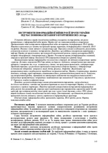 У статті здійснено спробу дослідження найбільш поширених інструментів, які росія використовує у інформаційній війні проти України під час повномасштабного вторгнення. Проаналізовано такі інструменти інформаційної війни як наратив, дезінформація, ІПсО, фейки. Наведено визначення цих понять та приклади прояву наративів, дезінформаційних кампаній, ІПсО та фейків. Вказано з якою метою їх використовує рф. Окреслено основні особливості, результати, успішність кожного із вказаних інструментів. Доведено, що найбільш поширеними наративами є міф про Україну як проєкт леніна, про київський нацистський режим, загрозу розширення НАТО, потребу денацифікації і демілітаризації в Україні. Розглянуто прояви дезінформаційних кампаній, зокрема на прикладі підриву Каховської ГЕС,викривлення історичних фактів тощо. Проаналізовано прояви інформаційно-психологічних операцій, які активно використовує країна –агресор. До таких належить ІПсО про мітки на дорогах і будинках, попередження про масовані обстріли у конкретні дні, т.зв. «символізм» у датах, та просування пропаганди у кіберпросторі. Продемонстровано, що російська пропаганда намагається здобути перевагу у кіберпросторі за допомогою кібератак, хакерських акцій, ботів, фішингу, діпфейків. Акцентовано що використання таких засобів росією передбачає погіршення іміджу України, її керівництва, зірвання допомоги, недовіру серед партнерів, виманювання даних, розповсюдження паніки та ін. Зазначено, що використання фейків, спрямовані на маніпуляцію свідомістю та емоційним станом людей і найчастіше проявляються у неправдивих повідомленнях про звільнення В. Залужного, призначення О. Сирського, невдачі на фронті тощо. Доведено, що росія використовує велике різноманіття інструментів, часто вдається до їхнього поєднання, з метою нав’язування наративів не лише на території України, а й для свого населення і у країнах-партнерах. Наведено приклади використання інструментів інформаційної війни росією для громадян рф, зокрема через повідомлення про перманентну ворожіть країн Заходу щодо рф, про непереможність їхньої армії, про силу і велич їхньої держави, успіхи СВО, обсяги втрат особового складу та військової техніки тощо. Констатовано, що діяльність російської пропаганди досить активна у межах українського інформаційного простору.