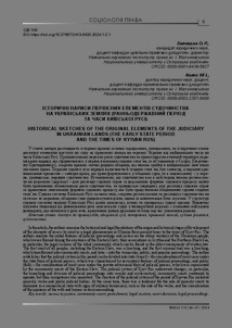 Балацька, О. Р. (O. Balatska) and Колос, М. І. (M. Kolos) (2024) Історичні нариси первісних елементів судочинства на українських землях (ранньодержавний період та часи Київської Русі) (Historical sketches of the original elements of the judiciary in Ukrainian lands (the early state period and the times of Kyivan Rus)). Соціологія права (№ 1-2). pp. 9-15.