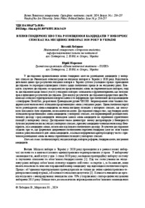 (This study analyzed the impact of gender quotas on the placement of candidates on electoral lists for the Rivne Regional Council in the 2020 local elections in Ukraine. The lack of detailed data on the results of local elections in Ukraine significantly complicates the process of conducting research and testing relevant hypotheses on political processes at the local level. Most existing studies focus on the representation of women in parliamentary elections, while research on their participation in local elections remains fragmented, which explains the lack of relevant research. To analyze the results of the study, we used data from the Rivne Regional Territorial Election Commission and information on the political experience of candidates from the PolitHub platform developed by the CHESNO Social Movement. The introduction of mandatory gender quotas was intended to increase the representation of women on local councils. However, political parties often placed female candidates in less favorable positions on election lists, which reduced their chances of being elected despite the quotas. The study emphasizes that gender quotas increased the representation of female candidates on electoral lists, but the uneven distribution of political experience among candidates reduced the chances of female candidates obtaining favorable positions on the electoral list. The study also demonstrates a significant disparity in the probability of being nominated for high positions on electoral lists, with male candidates having a higher probability than female candidates, regardless of their political experience. The results of the study suggest that formal compliance with gender quotas by political parties does not necessarily mean equal opportunities for women candidates, as informal selection criteria often result in women being placed in less favorable positions on electoral lists. )