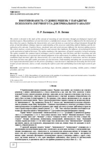 The article is devoted to the study of the concept of reasoning of court decisions through psychological, logical and doctrinal aspects. Reasonableness of court decisions is a multifaceted concept, which is influenced by the interaction of these three key aspects. Studying the characteristics of a court decision as a special type of legal document through the prism of interdisciplinary dialogue improves understanding of the processes underlying judicial thinking and the formalization of its outcome. Cognitive biases, emotional state and social pressure influence the decision-making process. The article analyzes certain psychological theories and concepts that emphasize the influence ofpsychological factors on the motivation of judicial decisions. The author emphasizes the importance of logical consistency in legal reasoning. The author examines the common logical techniques, used in rendering court decisions and their reasoning, and also identifies the importance of consistent and rational judgments in law enforcement. In addition, the author examines how established legal doctrines affect the characteristics of a court decision, including its motivation, and howdeviations from these doctrines may affect public perception of court decisions. Understanding and taking into account psychological, logical and doctrinal aspects in the process of making a court decision is important for increasing the level of motivation of court decisions, and as a result, ensuring the right to a fair trial and building trust in the legal system in general