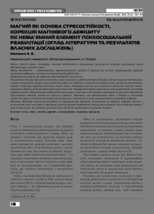 Мета дослідження – обґрунтування взаємозалежності магнію зі стресом як основи впровадження корекції магнієвого дефіциту в систему психосоціальної реабілітації.