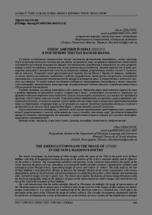 (The article investigates the functioning of ethno-images within the space of the USA in the poetic texts of Vasyl Makhno with help of imagological method, focusing on the problem of the writer`s national identity and its influence on the author`s creativity. The cosmopolitan worldview and openness to the world are represented in the poetry of the writer, based on the poetics of a new nomadism, overcoming the borders of other countries, expanding the worldview and axiological system through travels, representing images of «own» and «alien» or «other». The study analyzes the role of Vasyl Makhno`s relocation from Ukraine to America, the nomadic lifestyle of the writer, acquaintance with various geographical, political, historical and cultural environments in establishing the author`s ethno-identity and reproducing auto- and hetero-images in writer`s poetic texts. The article also explores the features of hetero-image formation within the American topography, analyzes the influence of space on the representation of «other» images and characterizes the loci of the USA in the reception of Vasyl Makhno. The work demonstrates that the author identifies himself as Ukrainian. Accordingly, the image of representatives of the Ukrainian nation in the reconnaissance is marked as auto-image («own»), while images of other nations are heteroimages («alien/other»). It is noted that the leading motif of the American subtext is existential loss, which affects the perception of the space of the USA and the image of «other» within it. The scientific investigation substantiates that the lyrical hero is accompanied by a sense of alienation, as on the territory of «own» country, he has long become a stranger to representatives of the native nation, and in the coordinates of the heterospace, he still does not feel «his own». Attempts to assimilate with the «other» and to accustom oneself to the loci of the USA, especially New York, are witnessed in order to find one`s own home of being. In addition to the American ethno-image, the scientific study also analyzes representatives of other nationalities represented in the text, the most prominent of which are Chinese, Mexicans and Jews. The article investigates the decorative authorial elements of image formation, which consist of the use of vivid symbols serving as identifiers of different nationalities.)