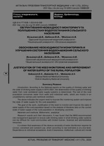 Валькевич, Д. В. (D. Valkevich) and Бабієнко, В. В. (V. Babienko) and Мокієнко, А. В. (A. Mokienko) (2024) Обґрунтування необхідності моніторингу та поліпшення стану водопостачання сільського населення (Justification of the need monitoring and improvement of water supply of the rural population). Актуальні проблеми транспортної медицини (№ 1). pp. 36-44.