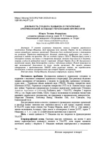 У статті висвітлено діяльність знаного історика українського походження Теодора Мацьківа, який працював поза межами України та був активним членом громадських наукових організацій. Визначено його особистий внесок у становлення та розвиток Українсько-американської Асоціації українських професорів та участь у реалізації її завдань та проєктів. Під час життя і праці в США Т. Мацьків брав участь в обговоренні питань, пов’язаних із створенням Асоціації, активно долучався до її ініціатив, зокрема, входив до редакційної колегії з перекладу «Історії України-Руси» М. Грушевського англійською мовою, брав безпосередню участь у підготовці видання. Вчений намагався по мірі можливостей долучатися до інших заходів організації. Він завжди активно співпрацював з представниками УААУП задля реалізації завдань, які передбачають дослідження, а також поширення знань про історію України за кордоном.