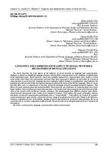 (У статті описано основні аспекти впливу соціальних мереж на мову й комунікацію. Закцентовано на спрощенні мовних практик під час онлайн-спілкування в умовах глобалізації інформаційного простору. Соціальні мережі, які частково замінили живе спілкування, сконструювали віртуальний світ у межах якого ті хто комунікують між собою здійснюють персуазивний вплив один на одного. У результаті спілкування в соціальних мережах мовний дискурс зазнає кардинальних змін до спрощення, що свідчить про можливість загрози для подальшого розвитку й збереження норм літературної мови. Однак, соціальні мережі дозволяють користувачам спілкуватися в режимі реального часу, надаючи перевагу швидко обмінюватися повідомленнями та хутко реагувати на них. Це дозволяє забезпечити жваву комунікацію та отримувати миттєвий зворотній зв’язок. Соціальні мережі надають перевагу комунікувати зі значно більшою авдиторією, ніж у звичайному особистому спілкуванні, що призводить до переплетіння реального та віртуального соціального життя. Користувачі віртуального світу можуть знаходити нових друзів, колег, однодумців з різних країн та культур. Соціальні мережі демонструють нову реальність нашого іманентного буття, яка відображає мозаїчність думок, інтересів і бажань учасників мережевого спілкування, формують «віртуальну ідентичність», яка впливає на створення сучасного соціального комунікативного простору та на конструювання нового образу інфолюдини у світі. Саме завдяки оперативності, креативності, креалізованості текстів, архівабельності, свободі слова й інтерактивності мережевої комунікації використання соцмереж становить серйозну конкуренцію офіційним медіа. Соціальні мережі – це інтегрована частина нового віртуального соціального середовища.)
