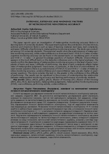 (У статті проведено дослідження чинників точності метакогнітивного моніторингу навчальних завдань студентів ЗВО. За допомогою експерименту досліджували деякі внутрішні, зовнішні та мнемонічні чинники, такі як тип навчального матеріалу, тип завдання, складність завдання та легкість/складність виконання, на точність метакогнітивного моніторингу. Дослідження проводилося серед 233 студентів університету. Емпіричні результати показують переважання точності метакогнітивного моніторингу, тоді як недостатня впевненість має тенденцію до зниження. Показники точності метакогнітивного моніторингу «+ +» можна знайти в найпростіших завданнях на запам’ятовування пар слів, а показники точності метакогнітивного моніторингу «– –» – у загальних питаннях середньої складності. Надмірна впевненість проявляється в найскладніших завданнях на дедуктивні умовиводи та логічні аналогії. Результати підтверджують залежність точності метакогнітивного моніторингу від рівня легкості/складності завдань та легкості/складності виконання; рівень складності завдання впливає на вищі показники неточностей метакогнітивних суджень, зокрема у вигляді надмірної впевненості. У запитаннях із відкритою відповіддю переважають судження типу «+ +» і «– –»; показники недостатньої та надмірної впевненості також вищі у запитаннях із відкритою відповіддю. Що складніше завдання, то більша впевненість у складності виконання. Результати можуть бути значущими в процесі розуміння зв’язку між точністю метакогнітивного моніторингу та успішністю навчання студентів університету.)