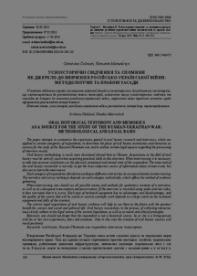 (The paper attempts to summarize the experience gained in oral history research and interviews, which are applied to certain categories of respondents, to determine the place of oral history testimonies and memories as sources for the study of the Russian-Ukrainian war, and to outline certain legal aspects regarding the processing of interview results. Oral history methodology is much more developed abroad than in Ukraine. Acquisitions in the field of oral history must be actively used when acquiring practical skills in this direction. When interviewing, it is necessary to take into account such factors as the physical, emotional and mental state of the respondent. The main task of the oral history researcher is not only to get the least subjective source of information about certain event, but also not to harm the interviewee. Each category of respondents (divided according to different criteria) has its own peculiarities in interviewing. The narrative and survey technique depends on each category individually, which affects the method of evidence gathering. When interviewing, one should use all possible means and methods for qualitative creation of a narrative, as well as its subsequent transcription and preservation. If the interview is recorded using audio and not video, it does not mean that it is worse. Each type of technical equipment has its advantages and disadvantages, and the quality of the source that will be stored or used in scientific work depends to a large extent on the technical equipment and skills of the scientist. The correct legal registration of oral history evidence will help to use them in the future with the greatest benefit for science and social and political life. Oral history researchers in the process of collecting memories must strictly adhere to the legal norms of the current legislation, as well as to moral and ethical principles. Moreover, one should not forget that the respondent is not a historical source; he or she is a living person with his or her own experiences, fears and emotions. Only in this case the creation of oral history sources will result positively.)