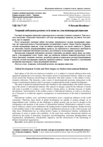 (Each sphere of life does not function in isolation, so it is subject to constant influences that make significant adjustments to its existence. The modern system of international relations, which is an open social system that functions and develops in interaction with other systems, is also subject to transformative influences. The dynamics, scale, course of transformational processes taking place in the system of international relations make it necessary to understand the trends of global development. The study of global development trends will contribute to the understanding of the further functioning of the system of international relations. The analysis of changes caused by the influence of trends will make it possible to conduct a more effective foreign policy, to develop forecasts of further development / transformation of the modern system of international relations, as well as to develop a set of measures to combat the negative consequences of transformations in the field of international politics. International conflicts, wars, and hybrid confrontation exert a significant influence on the world community. Therefore, these trends of global development are capable of making changes on an unprecedented scale. Conflicts are the challenges to global security and can lead to changes in the configuration and structure of the system of international relations. Globalization continues to maintain its influence, which can be attributed to the leading trends of global development. Studies devoted to this problem testify to the significant impact of globalization processes on the world economy and other areas. Globalization has an evident positive impact on international relations, facilitating the unification of actors to jointly solve problems. At the same time, modern international relations are affected by the trends of dynamism, integration and disintegration, increasing interdependence and fragmentation, hybridization, virtualization, migration, and the effectiveness of the functioning of distinct international organizations.)