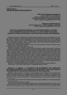 Актуальність. Незважаючи на загальновизнану важливість магнію, його біодоступність зазви- чай не вивчається, а вміст у пацієнтів не контролюється, тому магній називають «забутий катіон». Крім того, рівні магнію в сироватці зазвичай не відображають вміст магнію в різних частинах тіла. Отже, нормальний рівень магнію в сироватці крові не виключає дефіциту магнію. Гіпомагніємія та/або хронічний дефіцит магнію можуть призводити до порушень майже в кожному органі, сприяючи або посилюючи патологічні наслідки і спричиняючи потенційно фатальні ускладнення. Мета роботи – обґрунтувати необхідність визначення та корекції дефіциту магнію як есенційного макронутрієнта та стреслімітувального фактору. Матеріали та методи. Бібліометричні, аналітичні. Результати дослідження. Аналіз важливості магнію для підтримки хорошого стану здоров’я показав, що це есенційний метаболіт, макронутрієнт та фактор суттєвого впливу на різні біохімічні процеси й фізіологічні функції. Визнано важливим поширення дієтичних стратегій, які задовольняють добову рекомендовану норму магнію, та розробку надійних і мінімально інвазивних методів швидкого виявлення дефіциту магнію або для точного моніторингу ефективності його добавок. Показано, що близько в 60% дорослих споживання магнію з їжею є недостатнім і що субклінічний дефіцит магнію – поширене захворювання серед західного населення. Обґрунтовано профілактичну роль магнію щодо соціальних патологій та необхідність добавок магнію при багатьох захворюваннях. Результати власних досліджень дозволили встановити, що станом на 2021 рік (тобто до повномасштабної війни) особи працездатного віку отримували третину від рекомендованої норми магнію. Оскільки війна надзвичайно загострила цю проблему внаслідок стресу та інших соціальних проблем, обґрунтовано необхідність визначення та корекції магнієвого дефіциту з включенням цього складника в програму медичної, фізичної та психологічної реабілітації осіб, які постраждали під час війни. Висновки. Слід уважати обґрунтованою необхідність визначення та корекції магнієвого дефіциту.