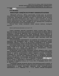 (International relations in the 21th century are experiencing the systemic crisis marked by an increase in the number of local conflicts and hybrid confrontations, as well as by the geopolitical rivalry. Transformations require the development and application of an effective mechanism to combat violations of international law. One of the mechanisms actively used today by participants in international relations is the application of sanctions. The paper analyses different types, purpose, specifics and other characteristics of international sanctions regarded as a tool of modern international policy. There is no certain definition of “sanctions” in international legal instruments. Along with the term, the terms “coercive measures”, “international legal responsibility”, “countermeasures”, etc. are used. International organizations and states are guided by their own advanced documents (i.e., international treaties, laws, etc.) which prescribe the mechanisms for international sanctions application. International sanctions are the form of international legal responsibility applied to a violator of international agreements. Sanctions as a tool of foreign policy are aimed to put pressure on the violating state to halt illegal actions. Sanctions can be imposed in several dimensions: diplomatic, economic, political, etc. Diplomatic sanctions are aimed at expressing disapproval or dissatisfaction with a certain action of the violating state through the international political isolation of the state. The application of the international sanctions involves the use of political means aimed at counteracting the illegal actions of violating countries allowing in such a way the use of the mechanism of international condemnation, partial isolation etc., which leads to negative changes in the image of the violating state. Economic sanctions are the measures of an economic nature directed at the violating state. In modern international relations, the practice of imposing economic sanctions is quite common, which outweighs the quantitative indicators of the total number of sanctions imposed. At the same time, modern international sanctions are mostly targeted as opposed to comprehensive sanctions which separate those responsible for pursuing a particular policy or taking certain actions against the country’s citizens.)