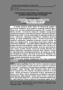 Вісич, О. (O. Visych) (2023) Структурно-стилістична функція ремарки в новелістиці Василя Стефаника (The structural and stylistic function of the Remark in the short stories of Vasyl Stefanyk). Прикарпатський вісник Наукового товариства імені Шевченка. Слово (18(69)). pp. 153-161. ISSN 23047402