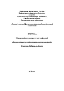 Ковальчук, І. В. (відпов. за вип.) (2025) Програма міжнародної науково-практичної конференції «ЛІНГВОКОГНІТИВНІ ТА СОЦІОКУЛЬТУРНІ АСПЕКТИ КОМУНІКАЦІЇ» 10 жовтня 2025 року, м. Острог. Вид-во НаУОА, Острог.