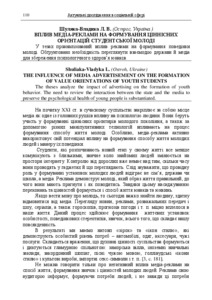 Шуляка-Владика, Л. В. (L. Shuliaka-Vladyka) (2022) Вплив медіа-реклами на формування ціннісних орієнтацій студентської молоді (The influence of media advertisement on the formation of value orientations of youth students). Актуальні дослідження в соціальній сфері. pp. 110-112.
