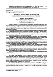 (The article examines the peculiarities of value orientation determination of students' professional self-determination. The results of an empirical study of the nature of value-oriented determination of pro- fessional self-determination on a sample of students are presented. The research is aimed at analyzing the theoretical understanding of the concept of professional self-determination and value orientation determination of this process. As a result of the theoretical analysis of scientific psychological literature, it was established that professional self-determination is manifested in the awareness, understanding, agreement and integration of the values of professional activity, professional community and personal values of the subject. Among a number of internal determinants of professional self-determination, which reflect the subjective conditions of choosing a profession, many authors single out certain value orientations. The development of the personal meaning of professional activity is important for successful professional development. In this context, the study of value orientation attitudes of students can reveal key aspects that determine their professional choices and directions of development. In the modern educational environment, the values of students become a significant element, influencing their attitude to learning, the choice of profession and the general development of the personality. Understanding the peculiarities of students' value orientations contributes to their support in professional self-determination and the creation of a favorable environment for their personal growth. The results of an empirical study are presented with the aim of elucidating individual criteria of influence on the process of choosing a profession by students, as well as the system of their value orientations according to the method of M. Rokych. It was concluded that students are not only focused on achieving success in their chosen profession, but also highly value aspects of personal development, social relations, creativity and health, taking into account both terminal and instrumental values.)