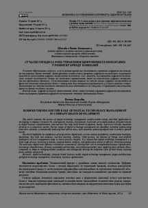 (This article examines the essence of digital technology management, modern market trends, and their application in developing a company’s brand in the contemporary business environment. It provides an in-depth analysis of modern trends in digital business transformation, showing how they help build brand recognition, loyalty, and trust–critically important elements in a competitive market. The key stages of digital technology management are identified, including implementing innovative solutions, systematically analyzing their effectiveness, and constantly optimizing digital tools to achieve optimal results. The article highlights the significance of using various digital tools–such as analytical platforms, marketing technologies, blockchain, Big Data and analytics, machine learning, chatbots, CRM systems, the Internet of Things, and artificial intelligence–at each management stage to ensure process integrity. It is argued that digital technology management is a multi-stage process involving systematic implementation, analysis, and optimization aimed at effective brand positioning. The main ways digital tools influence a brand are systematized, showing their role in strengthening business capitalization, increasing competitiveness, forming sustainable partnerships, and enhancing market value. Applying these methods allows companies to adapt to changing market conditions and strategically develop the long-term value of their brand, ensuring future stability and growth.)
