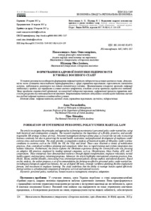 (The article investigates the principles and approaches to forming an enterprise’s personnel policy under martial law, using both historical and contemporary examples. The research emphasizes the importance of a flexible, proactive, and socially responsible HR strategy in times of crisis. Personnel management during wartime plays a crucial role not only in ensuring business continuity but also in preserving the mental health, motivation, and professional development of employees under extreme stress and uncertainty. The study provides a comparative analysis of historical models of HR policy under wartime conditions in countries such as the USSR, the UK, the USA, and Israel. These cases illustrate a variety of mobilization practices, from centralized workforce planning and compulsory labor laws to rapid training and civilian integration into military industries. Furthermore, the article explores the Ukrainian experience during the current full-scale war, focusing on adaptive HR practices employed by leading national companies such as Ukrzaliznytsia, Nova Poshta, ATB, and IT corporations. These enterprises have demonstrated resilience through digital transformation, employee relocation, mental health support, and emergency retraining programs. Moreover, the article highlights international corporate practices from Nestle, Toyota, and McDonald’s, showcasing crisis-oriented personnel policies during conflicts and natural disasters. Based on this analysis, the author proposes a set of recommendations for forming an effective personnel policy under martial law, including psychological support mechanisms, the use of digital HR tools, strategic workforce planning, flexible employment formats, and investment in employee learning. The study underlines that the ability to manage human capital effectively during wartime is a fundamental component of enterprise survival and national recovery.)