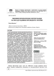 У статті проаналізовано чинники призначення штатних та позаштатних радників президентів України з 1991 по 2025 рік та виявлено чинники, які впливають на призначення кандидатів на посаду радника. В українському дискурсі тема призначення радників є малодослідженою, зокрема в наукових статтях не досліджують особливості призначення тих чи тих кандидатів на такі посади. Від рішень президента залежить ефективність управління державою, тому питання кваліфікованості та досвіду його радників є актуальним. У дослідженні використано регресійний аналіз (лінійну регресію та бінарну логістичну регресію) для виявлення чинників, які впливають на призначення радників.. З’ясовано, що для позаштатних радників ймовірність довшого перебування на посаді є більшою, ніж для штатних. Аналіз виявив такі чинники, які впливають на період перебування на посаді радника; штатний/позаштатний радник; попередня співпраця з президентом та електоральний досвід; особисті зв’язки, які характеризуються попередньою співпрацею президента та радника, що подовжують період перебування; досвід балотування і можливість бути обраним, що зменшує період перебування на посаді радника. Призначення радників на посаду відбувається з перевагою лояльності кандидата, а не його компетентності. Президент віддасть перевагу лояльному кандидату, який буде підтримувати його політику. Це дослідження розкриває важливість призначення радників, які впливають на формування внутрішньополітичних та зовнішньополітичних рішень президента.