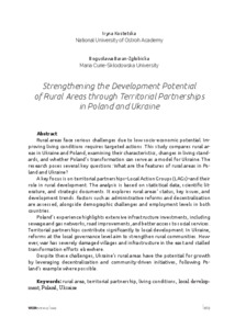 Rural areas face serious challenges due to low socio-economic potential. Improving living conditions requires targeted actions. This study compares rural areas in Ukraine and Poland, examining their characteristics, changes in living standards, and whether Poland’s transformation can serve as a model for Ukraine. The research poses several key questions: What are the features of rural areas in Poland and Ukraine? A key focus is on territorial partnerships–Local Action Groups (LAGs)–and their role in rural development. The analysis is based on statistical data, scientific literature, and strategic documents. It explores rural areas’ status, key issues, and development trends. Factors such as administrative reforms and decentralization are assessed, alongside demographic challenges and employment levels in both countries. Poland’s experience highlights extensive infrastructure investments, including sewage and gas networks, road improvements, and better access to social services. Territorial partnerships contribute significantly to local development. In Ukraine, reforms at the local governance level aim to strengthen rural communities. However, war has severely damaged villages and infrastructure in the east and stalled transformation efforts elsewhere. Despite these challenges, Ukraine’s rural areas have the potential for growth by leveraging decentralization and community-driven initiatives, following Poland’s example where possible.