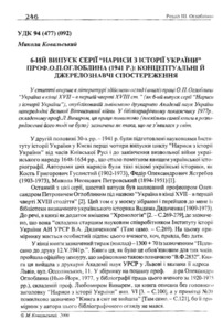 У статті вперше в літературі здійснено огляд і аналіз праці О. П. Оглоблина “Україна в кінці X V I I -в першій чверті XVIIIст. " (як 6-ий випуск серп “Нариси з історії України”), опублікованій львівською друкарнею Академії наук України напередодні Великої Вітчизняної війни. У бібліографічному покажчику 1977р., складеному проф.Л. Випаром, ця праця помилково (наскільки самої книги в розпорядженні його тоді не було) зазначена як така, що не з ’явилася у світ.