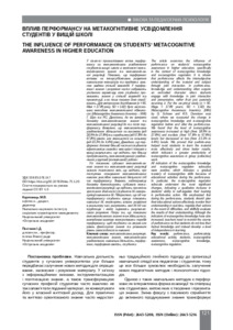У статті проаналізовано вплив перформансу на метакогнітивне усвідомлення студентів вищої школи в контексті метакогнітивного знання та метакогнітивної регуляції. Показано, що перформанс впливає на інтерсубʼєктивне розуміння навчального матеріалу та предмета загалом завдяки спільній взаємодії. У перформансі знання і розуміння часто набувають утіленого характеру, коли студенти проживають знання у спільній взаємодії та презентації, а не лише пасивно його сприймають. Для емпіричного дослідження (n = 90, Mвік = 17.89 року, SD = 1.42) було застосовано методики метакогнітивної обізнаності (Metacognitive Awareness Inventory – MAI) Г. Шро та Р.С. Деннісона, де ми виміряли динаміку метакогнітивного знання та метакогнітивної регуляції до та після перформансу. Виявлено, що метакогнітивне усвідомлення збільшилося на високому (від 18,9% до 27,8%) та середньому (від 57,8% до 67,8%) рівнях, але зменшилося на низькому (від 23,3% до 4,4%) рівні. Доведено, що перформанс допоміг більшій частині студентів ефективніше засвоїти матеріал і показати кращі результати, що свідчить про більшу продуктивність метакогнітивного усвідомлення у груповій (колективній) роботі. Усі показники субшкал метакогнітивного знання та метакогнітивної регуляції зазнали позитивних змін, що свідчить про поступове опанування метакогнітивних навичок унаслідок навчальної діяльності під час перформансу. Зокрема, найяскравішу динаміку демонструють субшкали метакогнітивної регуляції, що свідчить про якісне зростання здатності студентів до саморегуляції навчання в дії. Підкреслено, що під час перформансу студенти краще планують навчальні дії, моніторять власне розуміння в реальному часі, регулюють свої дії під час труднощів і вміло оцінюють результат свого розуміння. Попри те, що показники метакогнітивного знання теж збільшилися, викладачеві важливо контролювати перебіг перформансу, щоб студенти не втратили рівень фактичного знання та розвивали рівень самостійності в навчанні.