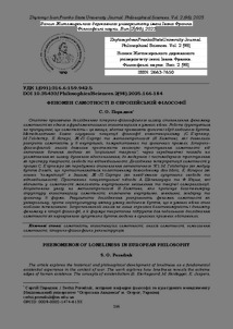 (The article explores the historical and philosophical development of loneliness as a fundamental existential experience in the context of war. The work explores how loneliness reveals the extreme edges of human existence. The concepts of existentialism (S. Kierkegaard, M. Heidegger, K. Jaspers, J.-P. Sartre) and meta-anthropology (N. Khamitov) provide the methodological basis to reveal loneliness in its internal, communicative, and extreme manifestations. Historical and philosophical analysis allows us to trace the evolution of the interpretation of loneliness: from the ancient view of man as a "social animal", through medieval views of solitude as a path to spiritual improvement, to modern and postmodern interpretations as a space for creativity, freedom, and responsibility. The interpretations of loneliness in the works of S. Kierkegaard (as a prerequisite for the formation of the authentic "Myself"), M. Heidegger (as the mode of being Dasein, as opposed to the collective impersonal das Man), K. Jaspers (as the basis of "communication" with the Other), J.-P. Sartre (as an integral companion of freedom and responsibility). The conceptual approaches of A. Schopenhauer and F. Nietzsche, who see the possibility of inner liberation and creative self-realization in loneliness, are traced. N. Khamitov emphasizes the meta-anthropology of loneliness by proposing a multidimensional structure that includes its internal, external, gender, and limit forms. The study’s results reveal the phenomenon of loneliness as a universal but sociocultural variable condition of human existence, which becomes particularly intense in wartime. The proposed analysis not only outlines the multidimensionality and dynamics of the phenomenon in the history of philosophy, but also forms a theoretical basis for further research on loneliness as an inseparable companion of human existence in modern crisis circumstances.)