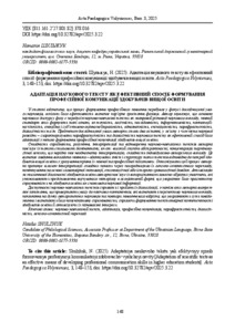 Шульжук, Н. В. (N. Shulzhuk) (2025) Адаптація наукового тексту як ефективний спосіб формування професійної комунікації здобувачів вищої освіти (Adaptation of scientific texts as an effective means of developing professional communication skills in higher education students). Acta Paedagogiсa Volyniense (Вип. 3). pp. 147-154.
