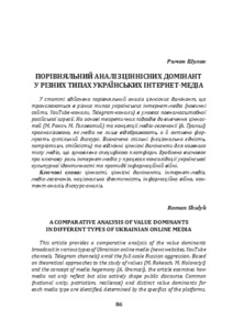 (This article provides a comparative analysis of the value dominants broadcast in various types of Ukrainian online media (news websites, YouTube channels, Telegram channels) amid the full-scale Russian aggression. Based on theoretical approaches to the study of values (M. Rokeach, M. Holovatyi) and the concept of media hegemony (A. Gramsci), the article examines how media not only reflect but also actively shape public discourse. Common (national unity, patriotism, resilience) and distinct value dominants for each media type are identified, determined by the specifics of the platforms. The conclusion emphasizes the key role of online media in consolidating Ukrainian cultural identity and countering information warfare. )